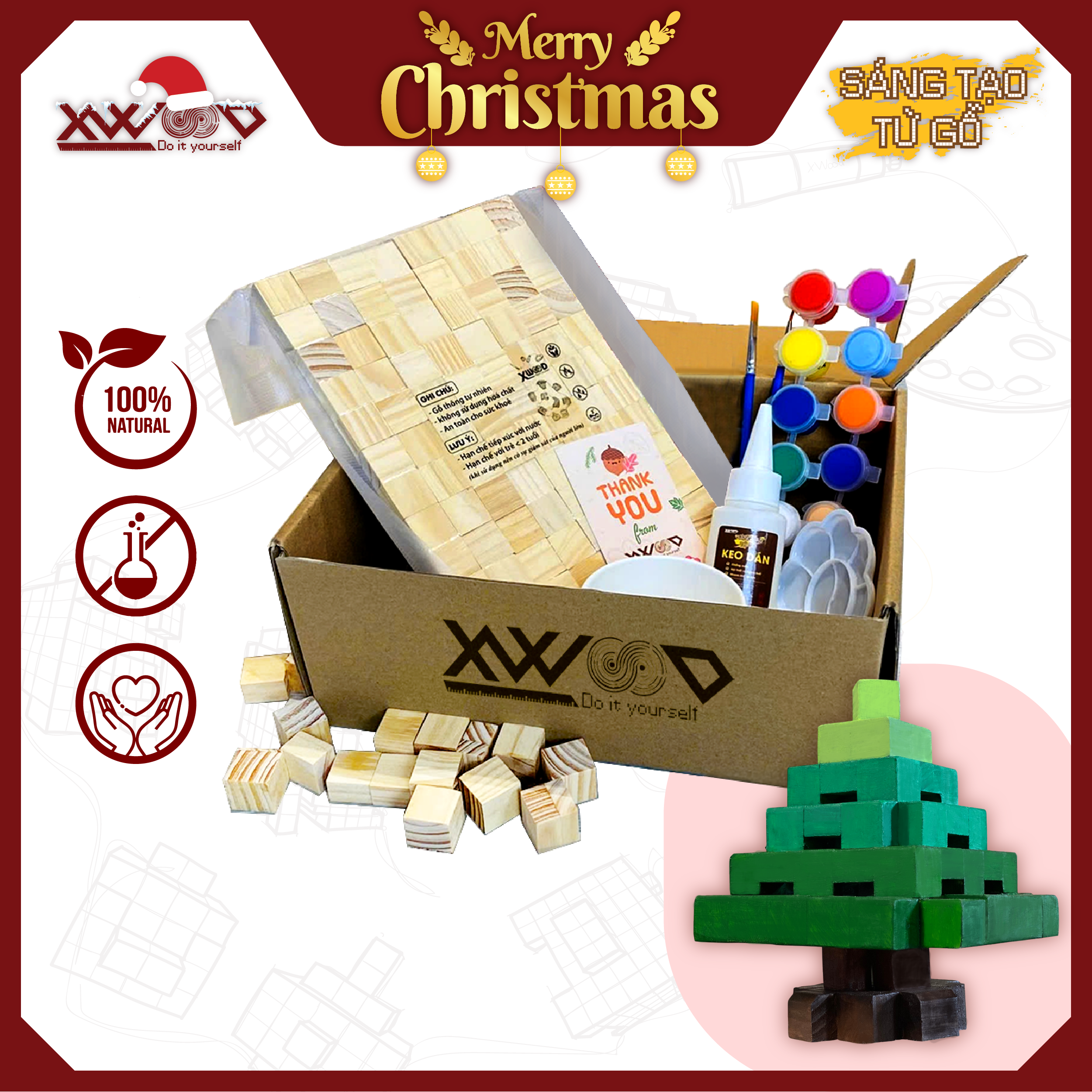 Xwood giới thiệu Bộ Lắp Ghép Viên Gỗ Sáng Tạo Cây Thông Noel – sản phẩm kết hợp hoàn hảo giữa xây dựng mô hình (lắp ghép) và mỹ thuật (tô màu) theo chủ đề Giáng Sinh. Sử dụng các viên gỗ cơ bản, bạn có thể lắp ghép thành hình dạng cây thông 3D, hộp quà, ngôi sao, và các vật phẩm trang trí khác. Phiên bản Size S (gồm 32 viên dẹt + 48 viên vuông) có mức giá cực kỳ phải chăng: 199.000đ, là công cụ hoàn hảo để phát triển tư duy không gian và sự khéo léo mùa lễ hội.
