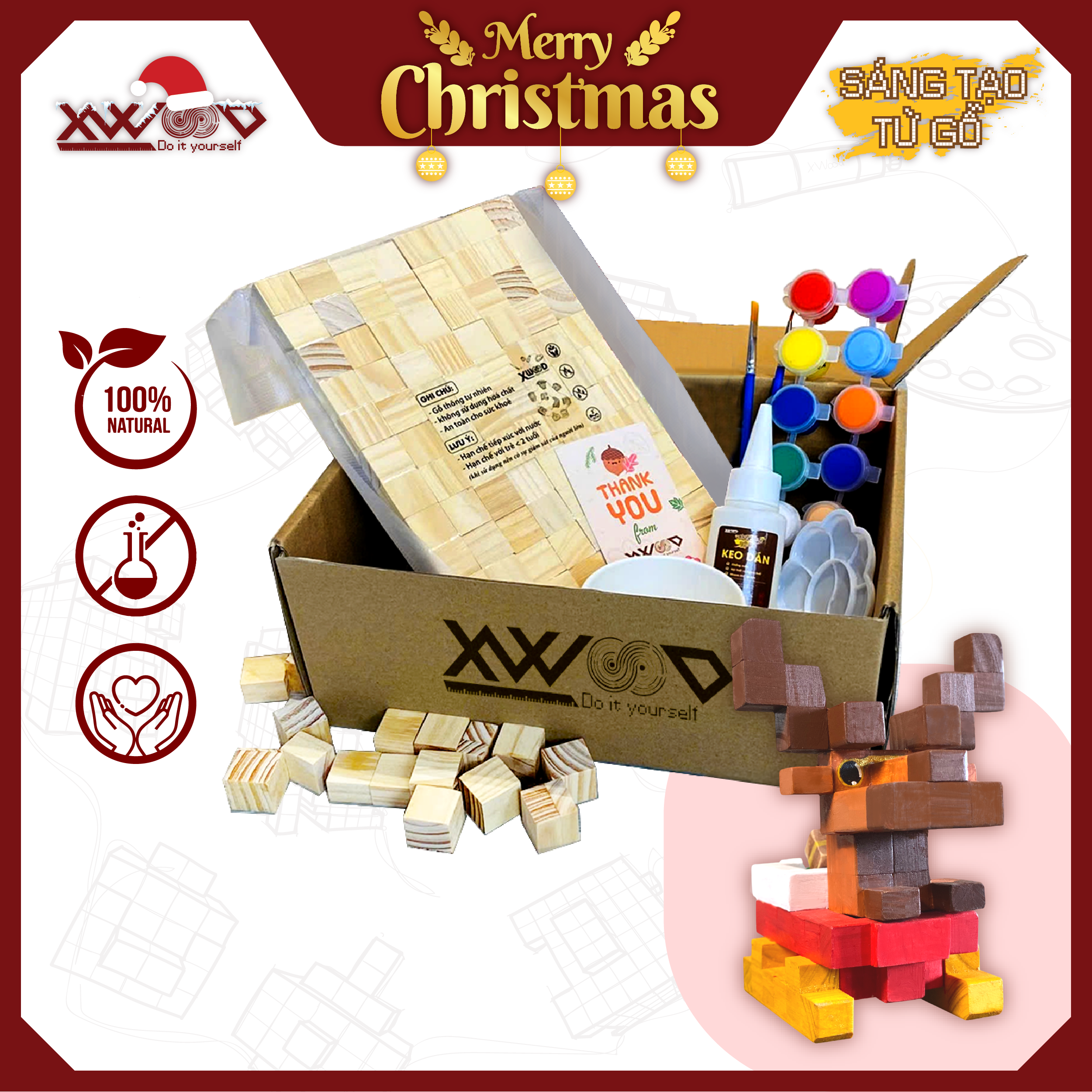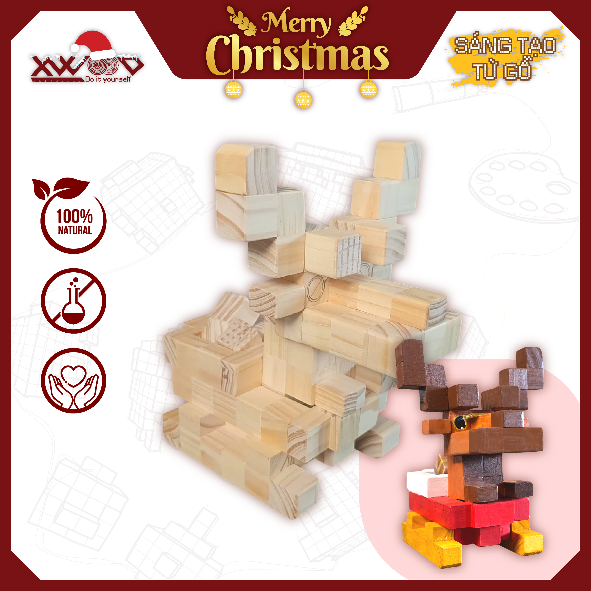 Xwood giới thiệu Bộ Lắp Ghép Viên Gỗ Sáng Tạo Tuần Lộc – sản phẩm kết hợp hoàn hảo giữa xây dựng mô hình (lắp ghép) và mỹ thuật (tô màu) theo chủ đề Giáng Sinh. Sử dụng các viên gỗ cơ bản, bạn có thể lắp ghép thành hình dạng Tuần Lộc, cỗ xe trượt tuyết, hoặc các vật phẩm trang trí khác. Phiên bản Size S (gồm 32 viên dẹt + 48 viên vuông) có mức giá cực kỳ phải chăng: 199.000đ, là công cụ hoàn hảo để phát triển tư duy sáng tạo mùa lễ hội.