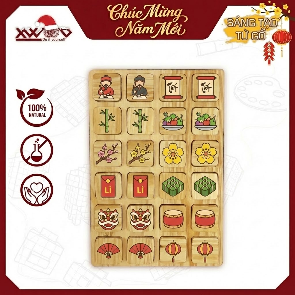 Xwood giới thiệu Board game siêu trí nhớ Mùa Tết Cổ Truyền – phiên bản lễ hội đặc biệt.. Với cách chơi cực kỳ đơn giản nhưng kích thích trí tuệ và sự tập trung, bạn sẽ cùng gia đình săn tìm những biểu tượng Tết như ông Công ông Táo, Bánh trưng, Bánh tét,… Bộ game này không chỉ là trò chơi mà còn là công cụ tuyệt vời để tạo nên những kỷ niệm ấm áp trong mùa lễ hội.